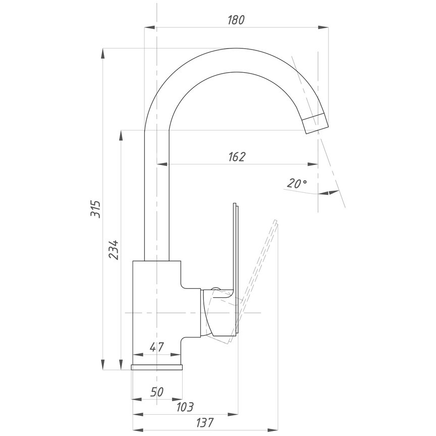 Регулирующий рычаг обтекаемой формы находится в передней части смесителя под изливом. Это техническое и современное дизайнерское решение. Современное, лаконичное и функциональное решение для вашей кухонной мойки от нашей компании производителя Профсан.
