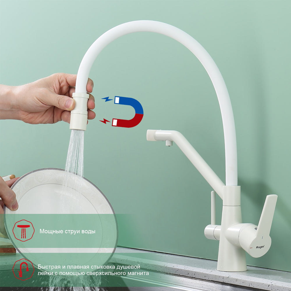 Доставка Смеситель для кухни с подключением фильтра Raglo (Рагло) R80.62.08, белый из Москва в районы и города ЮВАО, ЮЗАО, ЮАО, Новомосковский АО, Одинцово, Подольск, Щербинка, Троицк, Строительный рынок Славянский мир, 41-й км МКАД, бывшая Мельница, Красногорск, Домодедово, Тёплый стан, Коммунарка, Мосрентген, Видное, Мамыри, Краснознаменск