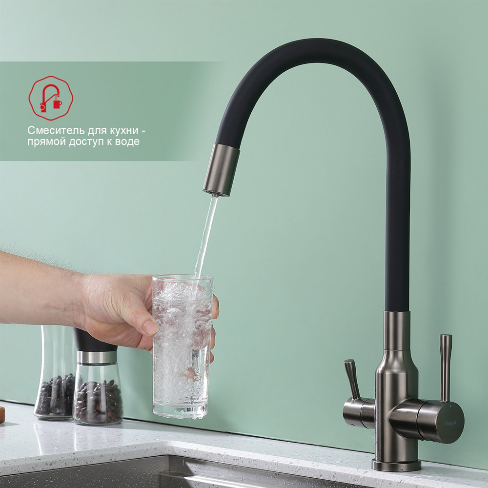 Доставка Смеситель для кухни с подключением фильтра Raglo (Рагло) R81.64.09, графит из Москва в районы и города ЮВАО, ЮЗАО, ЮАО, Новомосковский АО, Одинцово, Подольск, Щербинка, Троицк, Строительный рынок Славянский мир, 41-й км МКАД, бывшая Мельница, Красногорск, Домодедово, Тёплый стан, Коммунарка, Мосрентген, Видное, Мамыри, Краснознаменск