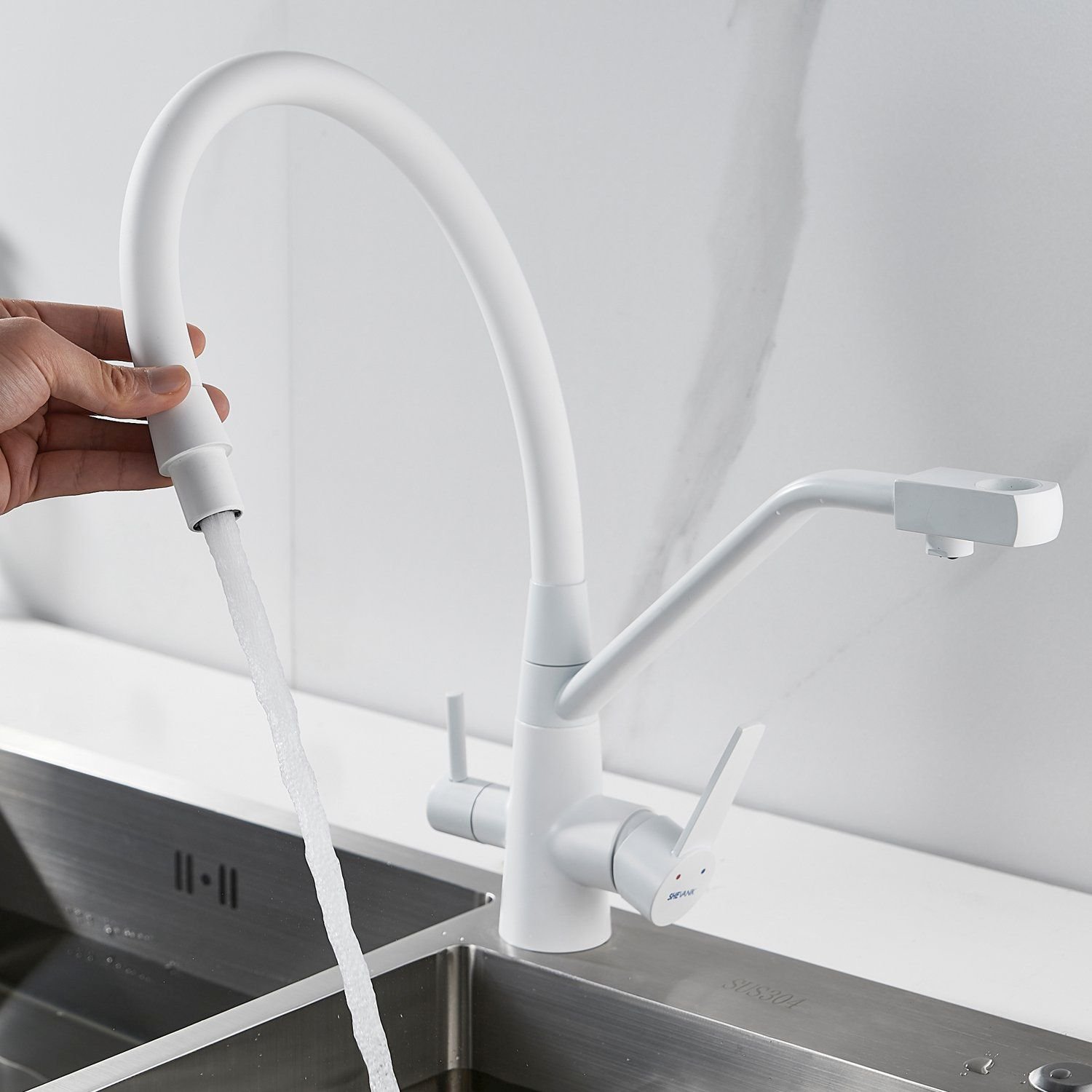 Доставка Смеситель для кухни с подключением фильтра Shevanik (Шеваник) S968C, белый из Москва в районы и города ЮВАО, ЮЗАО, ЮАО, Новомосковский АО, Одинцово, Подольск, Щербинка, Троицк, Строительный рынок Славянский мир, 41-й км МКАД, бывшая Мельница, Красногорск, Домодедово, Тёплый стан, Коммунарка, Мосрентген, Видное, Мамыри, Краснознаменск