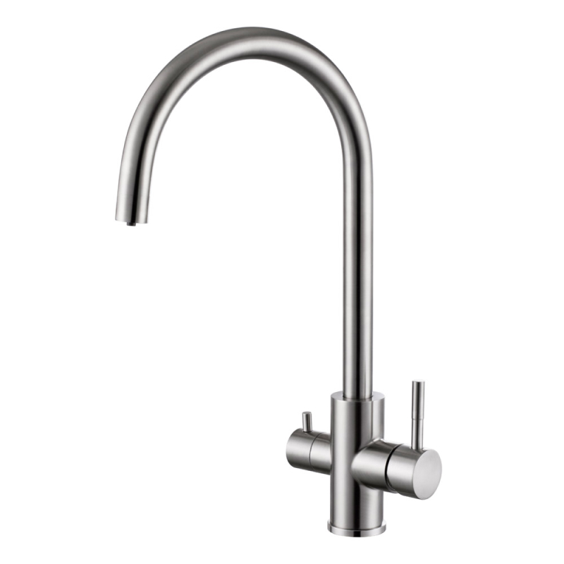 Смеситель для кухни под фильтр из нержавеющей стали EKO, EKO05-111. Смеситель изготовлен из нержавеющей стали SUS304. Данный материал отличается особой прочностью, износостойкостью и гигиеничностью. 0% Pb – нержавеющая сталь не содержит свинец, является экологически чистым материалом. Цвет: сатин. Керамический картридж 35 мм. ЭКО аэратор. Гибкая подводка EPDM в оплетке из нержавеющей стали 1/2″ 50 см. Пьедестал из нержавеющей стали.