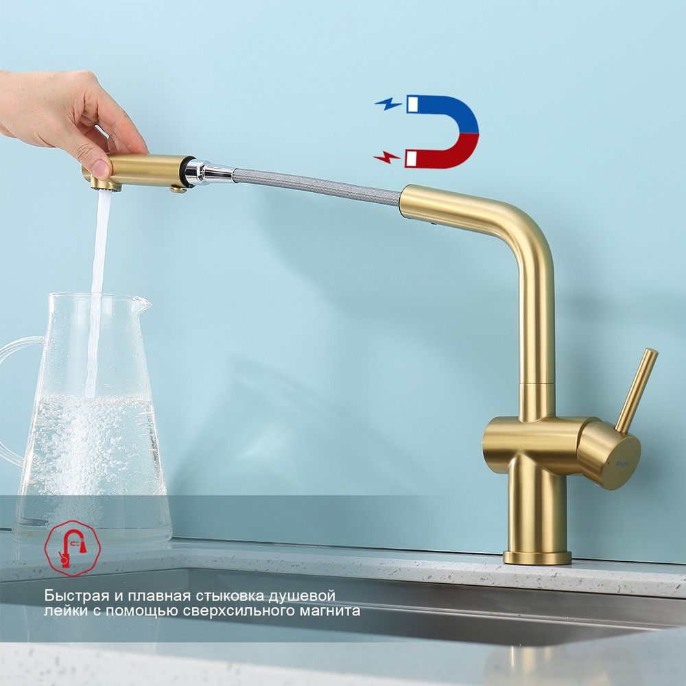 Доставка Смеситель для кухни с выдвижным изливом Raglo (Рагло) R86.49.03, золотой сатин из Москва в районы и города ЮВАО, ЮЗАО, ЮАО, Новомосковский АО, Одинцово, Подольск, Щербинка, Троицк, Строительный рынок Славянский мир, 41-й км МКАД, бывшая Мельница, Красногорск, Домодедово, Тёплый стан, Коммунарка, Мосрентген, Видное, Мамыри, Краснознаменск