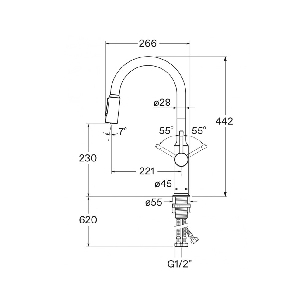 Для надёжности и долговечности в конструкции используются современные комплектующие. Внутренний керамический картридж 35 мм обеспечивает плавность хода ручки и точный контроль напора и температуры воды. Гибкие соединительные шланги длиной 60 см выполнены по технологии сшитого полиэтилена (PEX), что увеличивает их срок службы до 50 лет. Внешняя оплётка из нержавеющей стали защищает от разрывов и коррозии. Смеситель легко устанавливается на мойку благодаря системе крепления с двумя винтами, а стандартные гайки G1/2" соответствуют российским требованиям подключения. Для монтажа потребуется лишь отвертка, а отверстие в мойке должно иметь диаметр 33-35 мм.