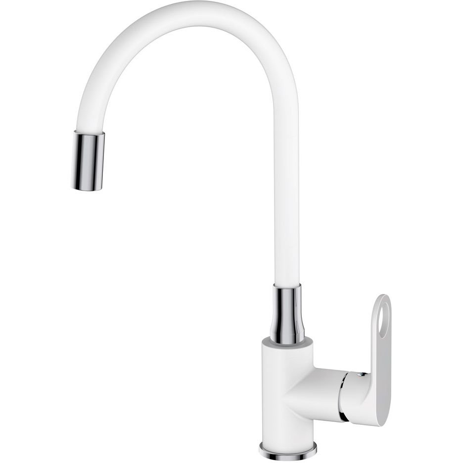Белый гибкий излив смесителя делаeт его необычным и красивым. Белый смеситель с элементами хрома отлично сочетается с кухонными мойками любых размеров и оттенков.