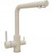 Высокий ,однорычажный. Керамический катридж 40 мм. Стандартное отверстие под смеситель, дополнительный выход на изливе, снабженным собственным аэратором, для фильтрованно й питьевой воды. В смесителе предусмотренно подключение третьего шланга, идущего от фильтра питьевой воды. В нижней части смесителя находится дополнительный кран для пуск а фильтрованной воды.