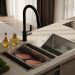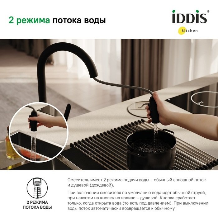Смеситель Cuba в трендовом черном цвете обладает улучшенным функционалом и хорошо узнаваемым дизайном плавных линий коллекции. Модель соответствует высоким стандартам любой современной кухни. Излив смесителя выдвигается на 45 см, что позволяет направлять струю воды в нужную точку раковины для поддержания безупречной чистоты. В смесителе предусмотрено 2 режима подачи воды: аэрированная струя – для быстрого наполнения емкостей и работы в привычном режиме; душ – для ополаскивания посуды или мытья овощей и фруктов. Переключение между режимами производится кнопкой на внутренней стороне излива. Смеситель Iddis прослужит долго благодаря надежному корпусу из прочной нержавеющей стали, неподверженной коррозии, резким изменениям давления и перепадам температуры воды. Матовое покрытие смесителя Iddis имеет электрофоретическое напыление, благодаря чему он прослужит дольше в условиях повышенной влажности. Керамический картридж обеспечивает точную регулировку температуры и напора воды за счет особенно плавного хода ручки смесителя. Гарантия на смеситель Iddis 10 лет.
