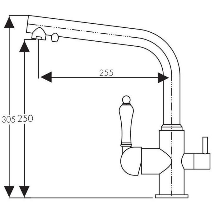 KAISER Vincent Chrome Смеситель для кухни под фильтр Характеристики Тип: однорычажный Назначение: для кухни Материал: латунь Запорный клапан: керамический картридж Тип излива: поворотный Форма излива: традиционная Возможность подключения фильтра: есть Монтаж Встраиваемый: нет Способ монтажа: вертикальный Количество монтажных отверстий: 1 Тип подводки: гибкая Комплектация Лейка: нет Донный клапан: нет Аэратор: есть Размеры Длина излива (мм): 225 Высота излива (мм): 250 Высота (мм): 305