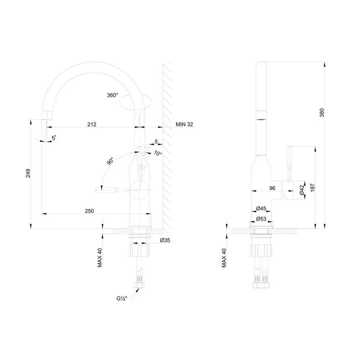Аэратор способствует экономии воды и улучшает качество струи. Гибкая подводка в комплекте упрощает установку, а максимальная толщина столешницы до 40 мм позволяет использовать смеситель в различных условиях.