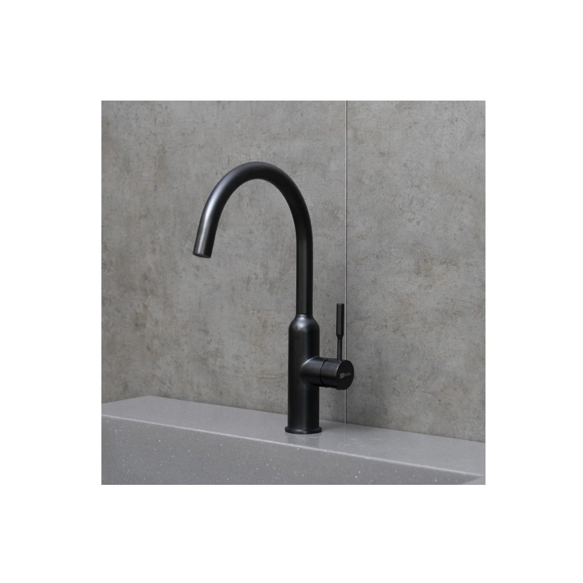 Смеситель устанавливается на раковину или столешницу, что делает его универсальным для различных кухонных пространств.