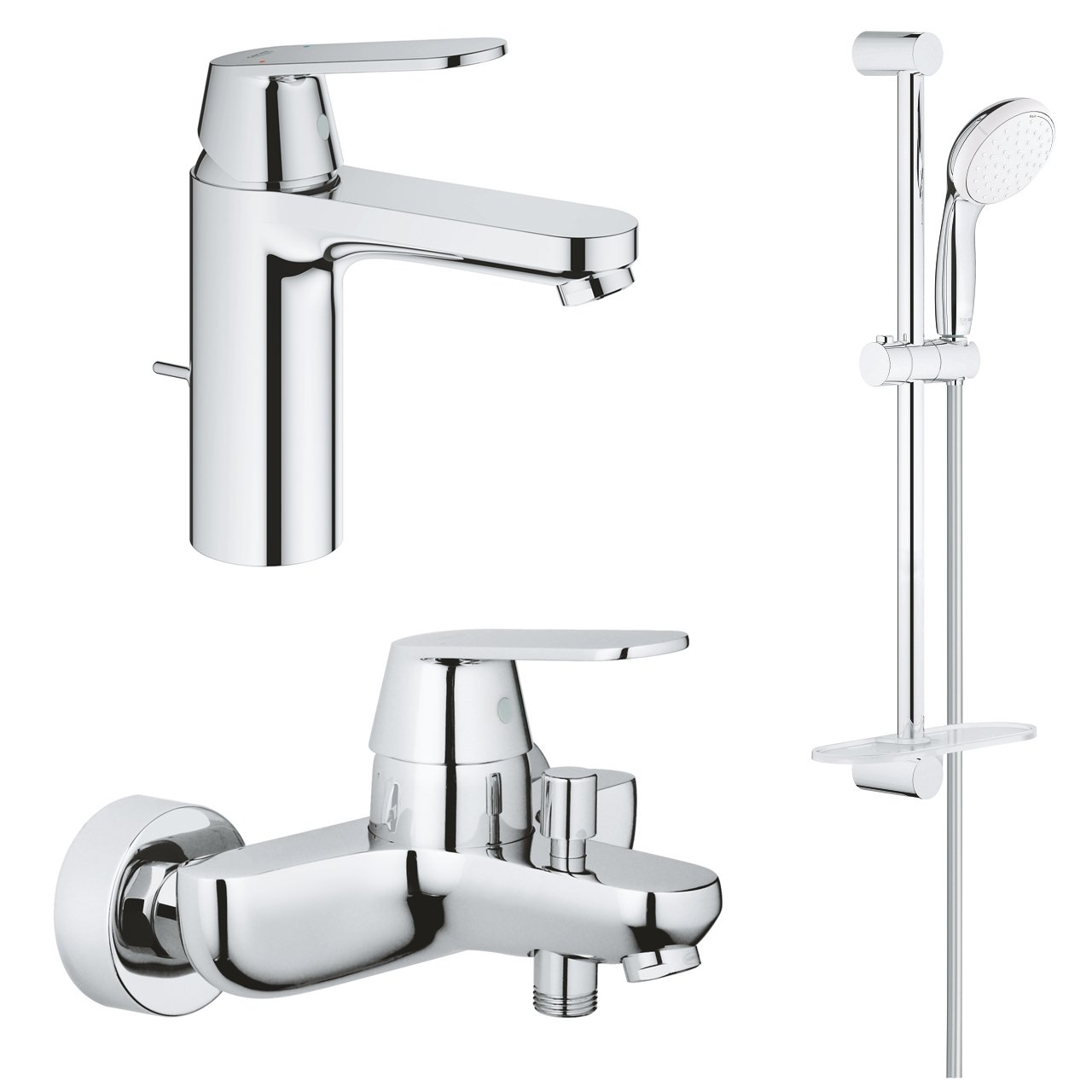 Доставка Комплект смесителей Grohe (Гроэ) Eurosmart Cosmopolitan для раковины, ванны с душевым гарнитуром и полкой, хром 1000179 из Москва в районы и города ЮВАО, ЮЗАО, ЮАО, Новомосковский АО, Одинцово, Подольск, Щербинка, Троицк, Строительный рынок Славянский мир, 41-й км МКАД, бывшая Мельница, Красногорск, Домодедово, Тёплый стан, Коммунарка, Мосрентген, Видное, Мамыри, Краснознаменск