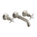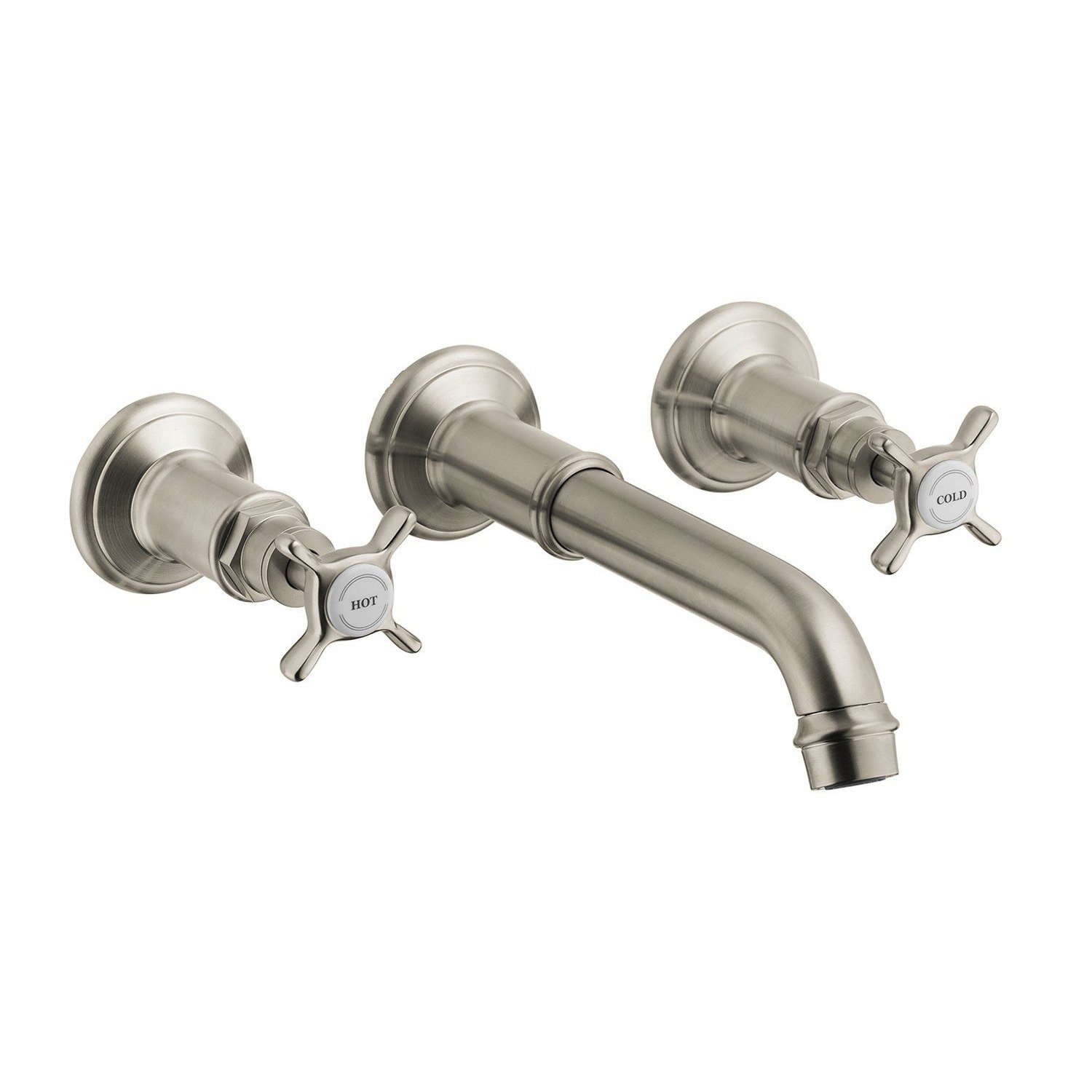 Смеситель для раковины, настенный монтаж на три отверстия, расход воды - 5 литров в минуту (при среднем давлении в системе), керамические буксы с поворотом на 90°, цвет изделия - 820 (Шлифованный никель), требуется скрытая часть для монтажа 10303180 (приобретается отдельно).