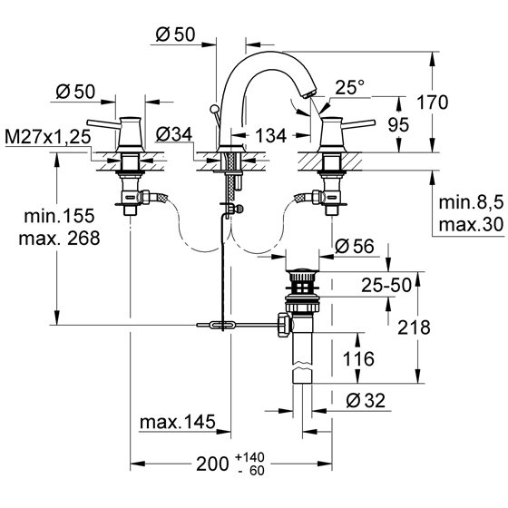 Смеситель для раковины Grohe (Гроэ) BauClassic на 3 отверстия, двухвентильный, хром (20470000)