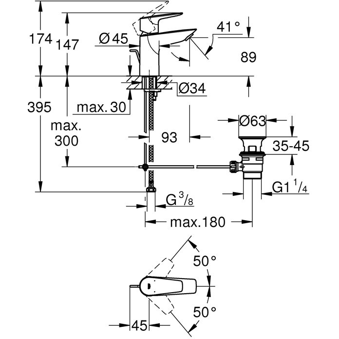 Смеситель для раковины Grohe (Гроэ) BauEdge с ограничителем температуры и рычажным донным клапаном, S-Size, хром (23328001)