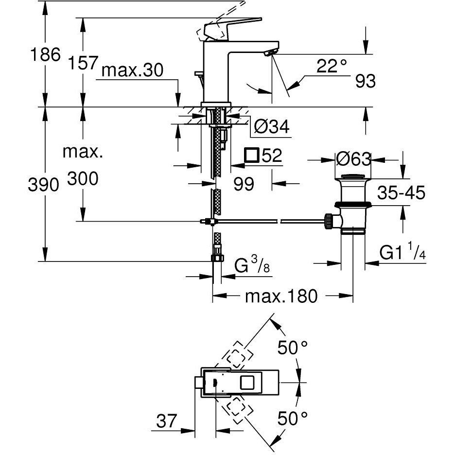 Смеситель для раковины Grohe (Гроэ) Eurocube с донным клапаном и ограничением расхода воды, хром (2312700E)