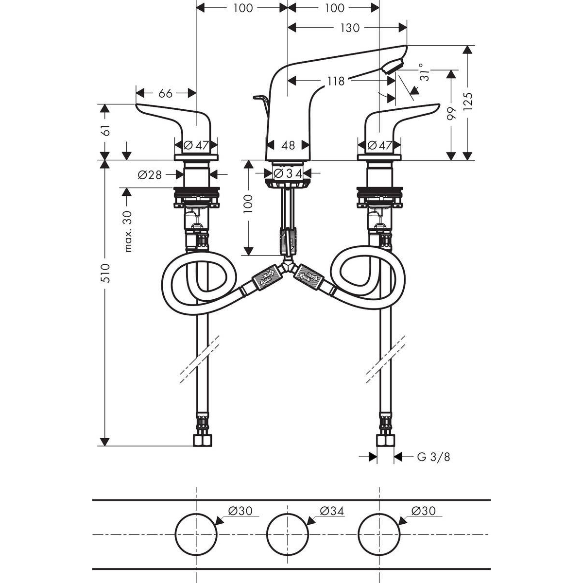 Смеситель для раковины Hansgrohe (Хансгрое) Novus 100 на 3 отверстия со сливным гарнитуром 71140000 хром