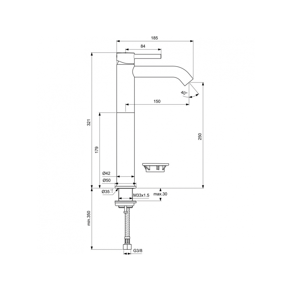 CERALINE Vessel Однорычажный смеситель для раковины с удлиненным корпусом, картридж 28 мм Firmaflow® с функцией HWTC (ограничение максимальной температуры горячей воды), гибкая подводка G3/8", монтаж IS-Fix - крепеж на центральной гайке M 33x1,5 с двумя блокирующими винтами (обеспечивает стабильную фиксацию смесителя), аэратор Cashe с ограничением потока 5 л/мин., металлическая рукоятка с индикаторами горячей / холодной воды, без донного клапана