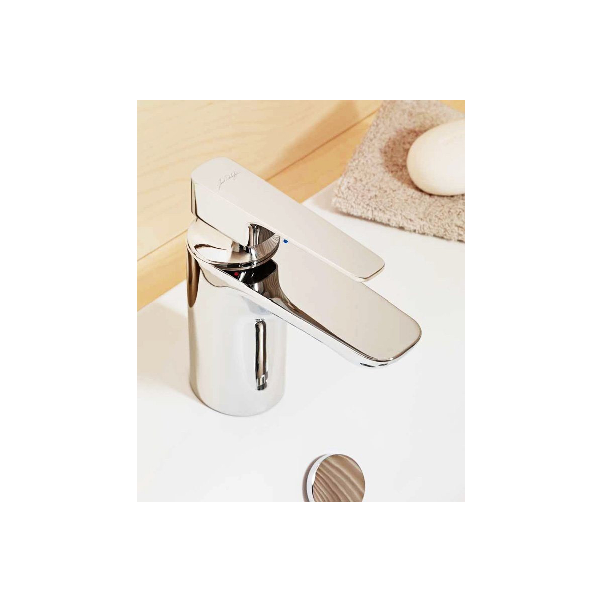 Jacob Delafon Aleo+ E72312 Смеситель для раковины (хром). Донный клапан в комплекте, Рычаг управления донным клапаном на корпусе смесителя, Донный клапан с переливом, Керамический картридж, Для монтажа необходимо 1 отверстие, Глянцевый, Подводка 3/8", С функцией экономии расхода, Расход воды: 5 л/мин, Оснащение: аэратор, гибкая подводка, система быстрого монтажа.