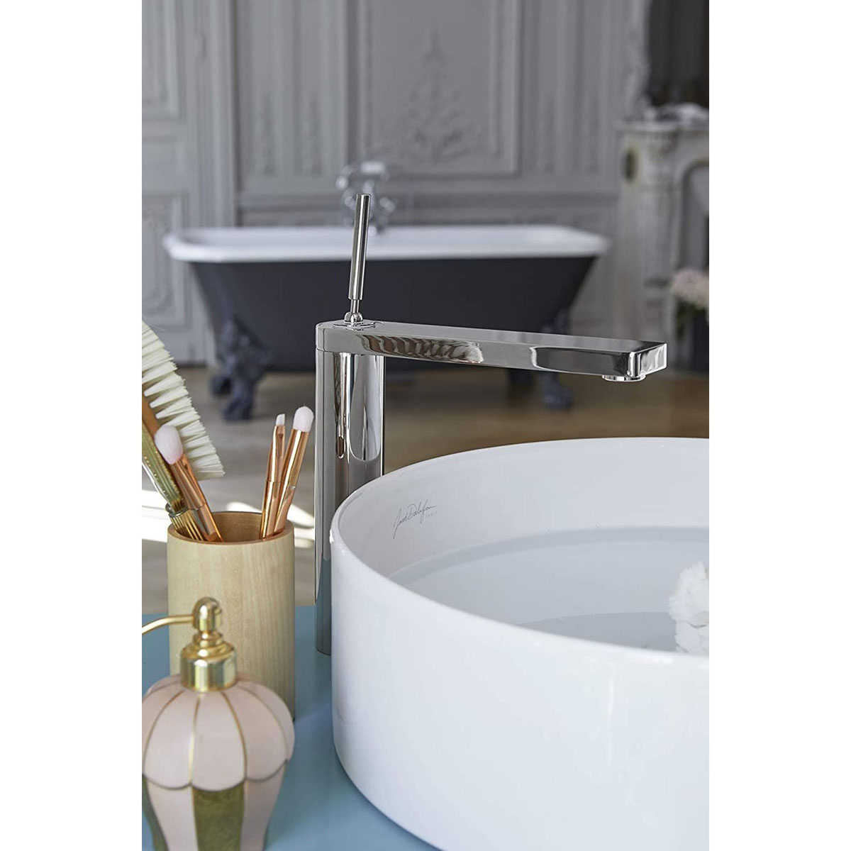 Jacob Delafon COMPOSED E73053-CP Высокий смеситель для раковины (хром). Надежное покрытие устойчивое к коррозии, Управление джойстиком, Металлический донный клапан, Легкий монтаж - латунная труба с резьбой, Керамический картридж, Подходит для раковины-чаши, С функцией экономии расхода, Расход воды: 5 л/мин, Оснащение: аэратор, гибкая подводка, крепления.