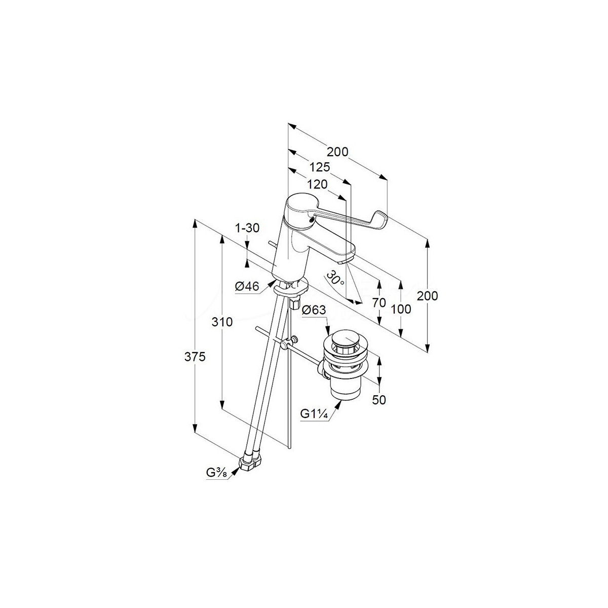 KLUDI Pure & Easy 372870565 Локтевой смеситель для раковины. Гарантия: 5 лет. Страна: Германия. Цвет: хром. Сливной гарнитур: донный клапан 1 1/4 дюйма. Форма: кубическо-цилиндрическая. Дизайн-стиль: современный. Вынос излива: 125 мм. Высота до излива: 70 мм. Длина шлангов подводки: 375 мм. Расход воды от-до: 7 л/мин. Управление: однорычажный. Подводка воды: гибкая с накидной гайкой 3/8 дюйма. Аэратор: стандартный. Излив: фиксированный. Механизм: керамический картридж. Материал: латунь. Комплект поставки: ограничитель температуры воды. Системы и технологии: предназначен для использования в медицинских учреждениях, система быстрого монтажа.