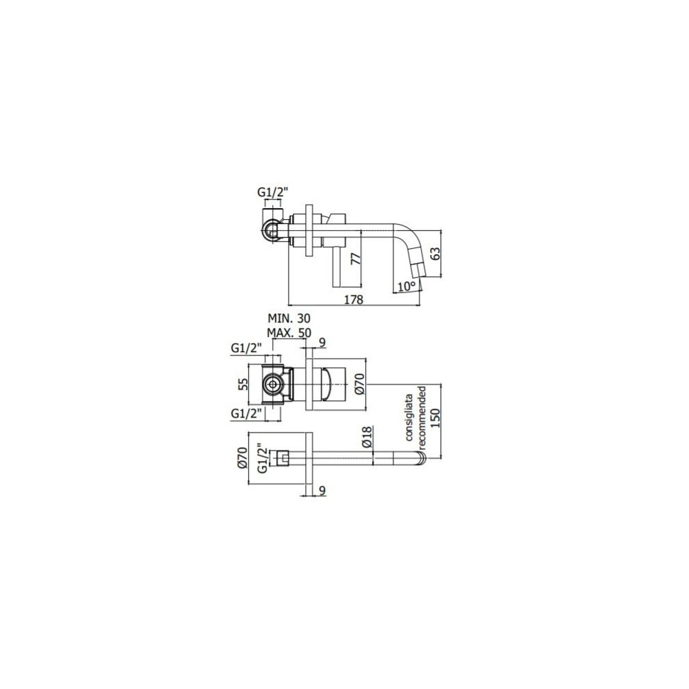 Paffoni Light LIG006NO70 Настенный смеситель для раковины (чёрный матовый). С внутренним механизмом. Излив 178 мм.