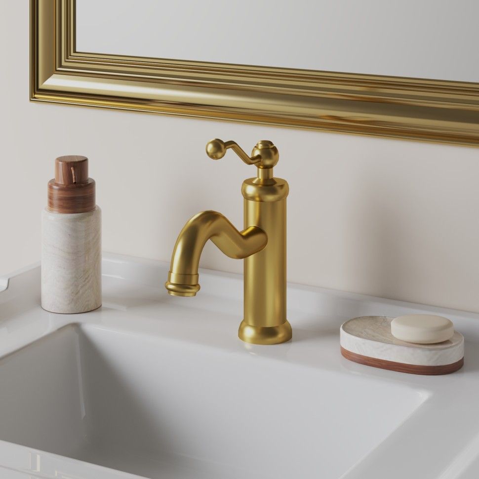Однорычажный смеситель для раковины сочетает в себе винтажный стиль с современной начинкой и функциональностью. Затейливая форма рычага делает стиль ретро удобным и практичным, а матовый золотой цвет покрытия, визуально расширяя пространство. Антикварные изгибы DUOMO будут органично смотреться в стилях классика, винтаж или по-новому раскроют интерьер в стиле фьюжн.