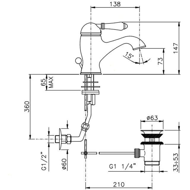 Смеситель Nicolazzi (Николации) Petit Mont Blanc для раковины однорычажный, с донным клапаном, ручки белая керамика, цвет: бронза 3402BZ76