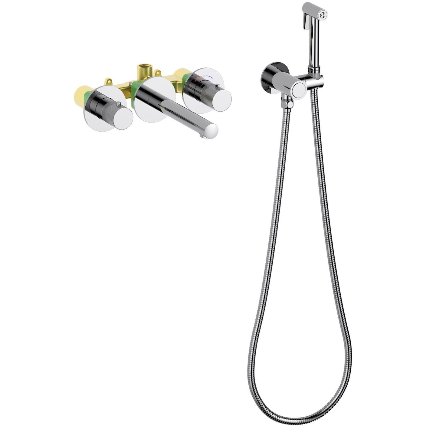 Комплектация:смеситель (наружная часть), внутренняя часть, шланговое подключение с держателем лейки, гигиеническая лейка, шланг, декоративные накладки, инструкция p>