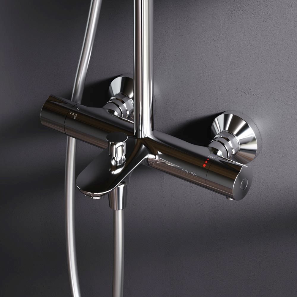 Тотальный дизайн в действии: все детали душевой системы – от пропорций ручного и верхнего душей до рисунка расположения форсунок на лейках – подчинены единой концепции в ультрамодном стиле Dynamic Organic. Продуманные детали для удобства использования: штанга регулируется по высоте в диапазоне от 1030 до 1460 мм обеспечивая комфорт для людей любого роста шаровый шарнир в держателе верхнего душа позволяет регулировать угол его наклона душевой шланг 1750 мм верхний душ диаметром 250 мм ручной душ диаметром 120 мм. Интенсивный напор даже при низком давлении в системе: инновационная функция AIR IN увеличивает напор вдвое при этом сокращая расход воды на 30%. Результат – экономия средств забота об экологии а главное – непередаваемое удовольствие от принятия душа. Смеситель для ванны и душа с термостатом: термостатический картридж с высокочувствительным термоэлементом стопором безопасности на 38 градусов быстрой реакцией на изменения температуры или давления надежно защищает от ожога даже при внезапном отключении холодной воды.