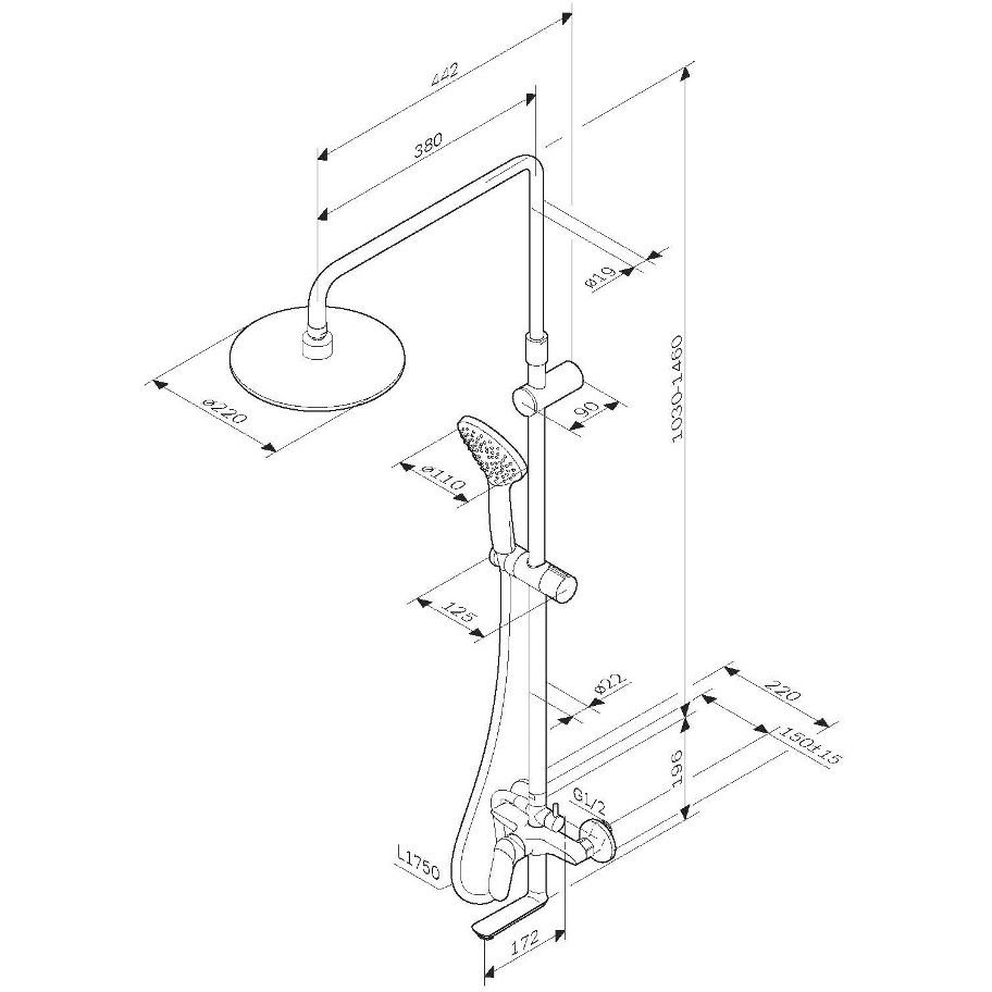 Тотальный дизайн в действии: все детали душевой системы – от пропорций ручного и верхнего душей до рисунка расположения форсунок на лейках – подчинены единой дизайн-концепции коллекции Sunny. Интенсивный напор даже при низком давлении в системе: инновационная функция Air In увеличивает напор вдвое при этом сокращая расход воды на 30%. Результат – экономия средств забота об экологии а главное – непередаваемое удовольствие от принятия душа. Диаметр душевых леек (верхний душ 220 мм и ручной душ 110 мм) позволит ощутить преимущества тропического душа даже в стандартной ванной тогда как увеличенная длина шланга 1750 мм обеспечит свободу движений во время принятия душа. Продуманные детали для удобства использования: телескопическая поворотная штанга регулируется по высоте в диапазоне от 1030 до 1460 мм обеспечивая комфорт для людей любого роста.