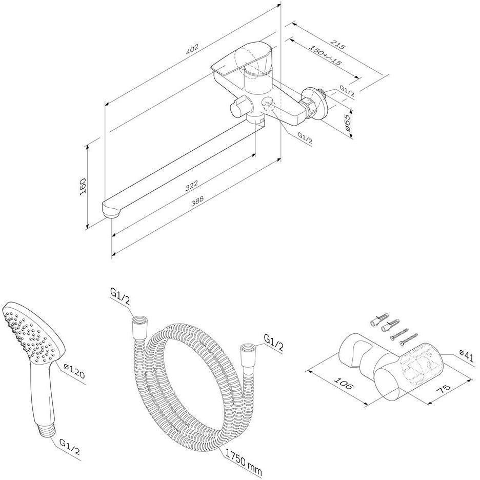 В комплекте душевой набор: стильный ручной душ 120 мм 1 режим, настенный держатель с регулировкой угла наклона, душевой шланг с защитой от скручивания.