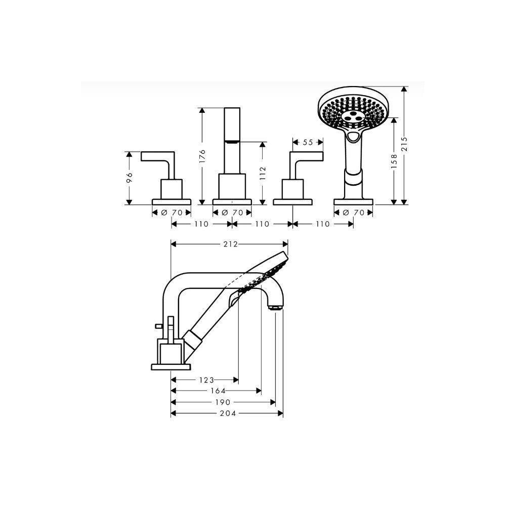 Смеситель для ванны на 3 отверстия, монтаж на плитку, ручной душ, шланг для душа, держатель для душа