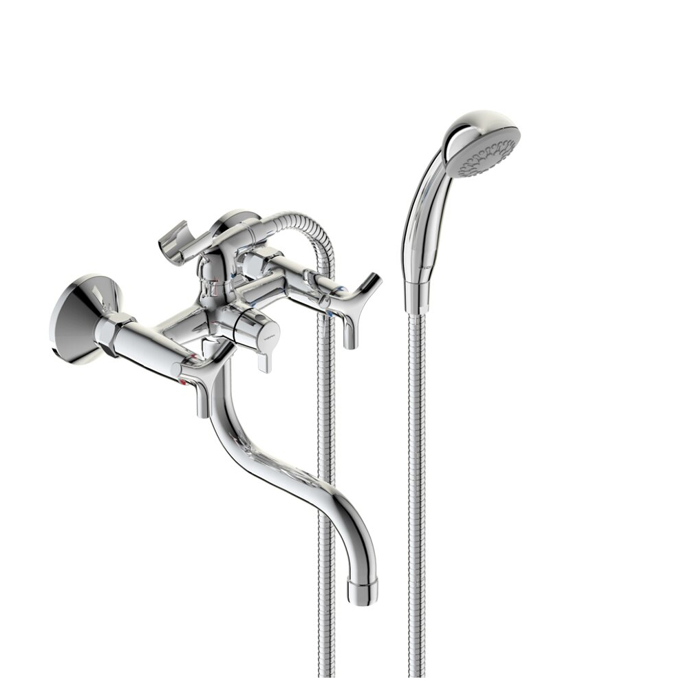 "Тринити" смеситель для ванны/душа двуручковый, настенный, с керамическим переключателем, трубчатый поворотный излив 150мм, лейка 70мм, держатель, шланг 1500мм, хром VIDIMA Trinity BA260AA