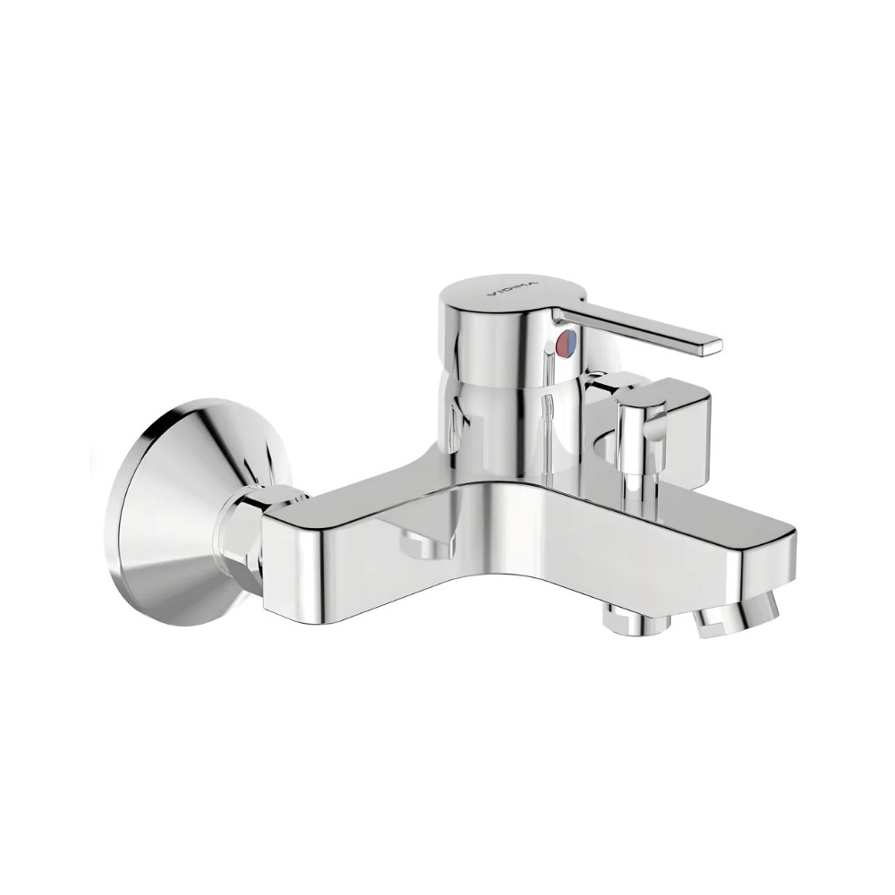 VIDIMA TECHNIK Настенный однорычажный смеситель для ванны/душа, монтаж на стандартных эксцентриках (в комплекте: эксцентрики, металлические отражатели, уплотнительные прокладки), литой излив, длина излива 95 мм, аэратор Perlator, керамический картридж 35 мм, металлическая рукоятка с индикаторами горячей / холодной воды, переключение ванна/душ: ручное (позволяет использовать функцию "душ" даже при очень низком давлении воды)