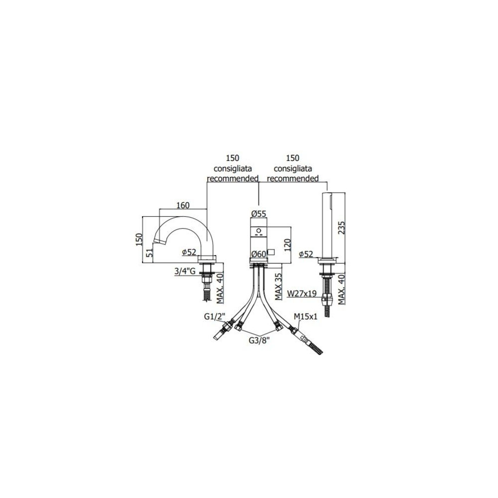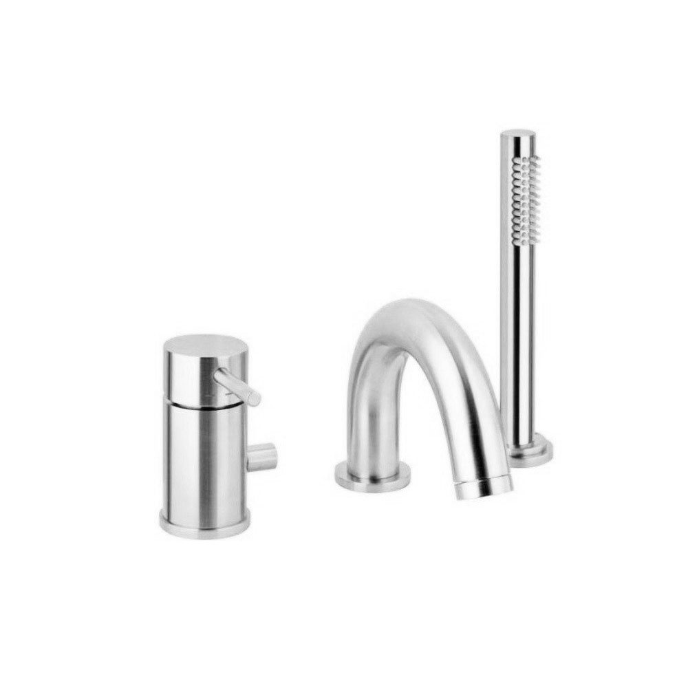 Paffoni Light LIG047ST Смеситель на борт ванны (нержавеющая сталь матовая). Монтаж на три отверстия. С автоматическим переключателем душ / излив. Излив 160 мм. В комплекте с ручным душем и выдвижным шлангом 175 см.