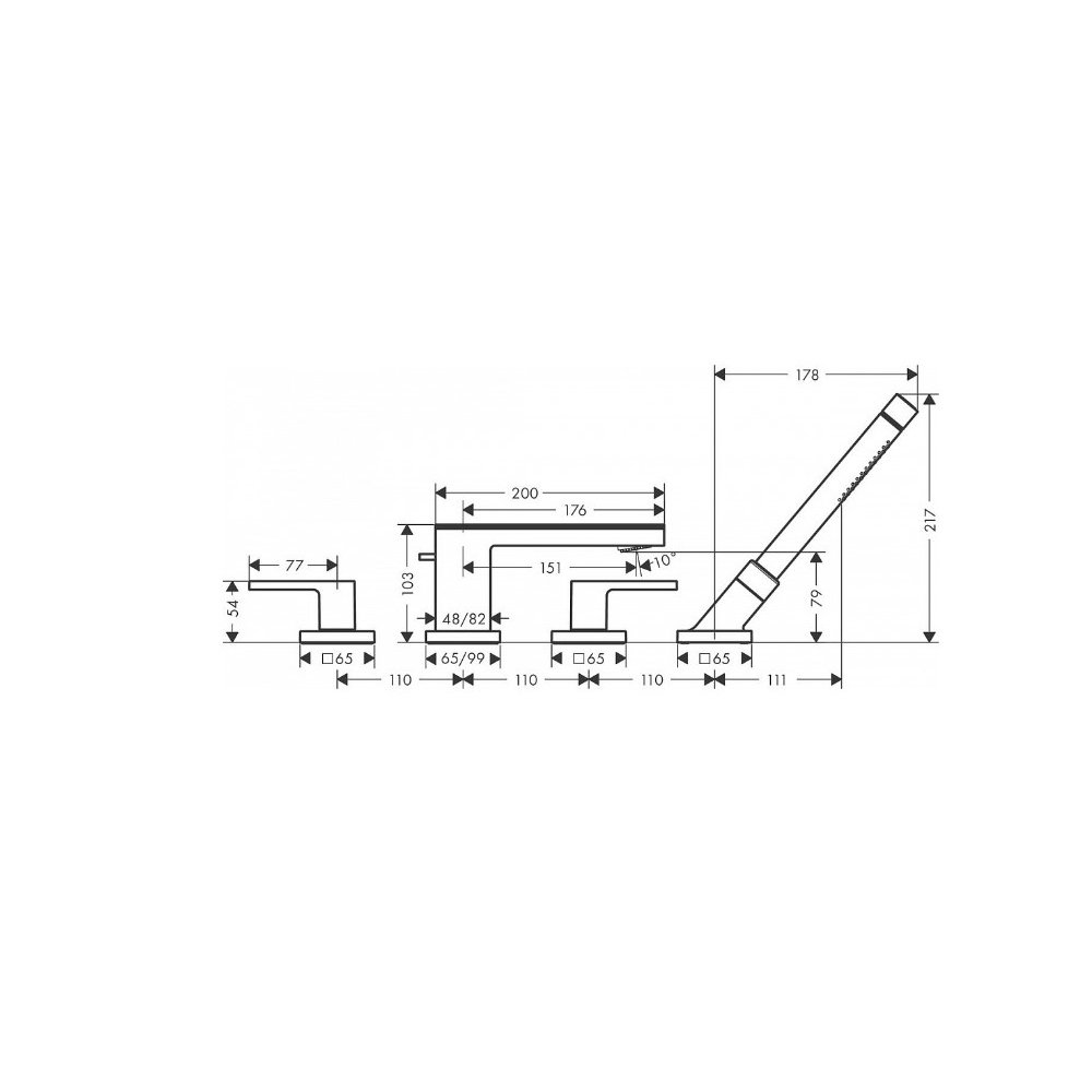 Смеситель на край ванны на 4 отверстия, ручной душ-"палочка", держатель для душа