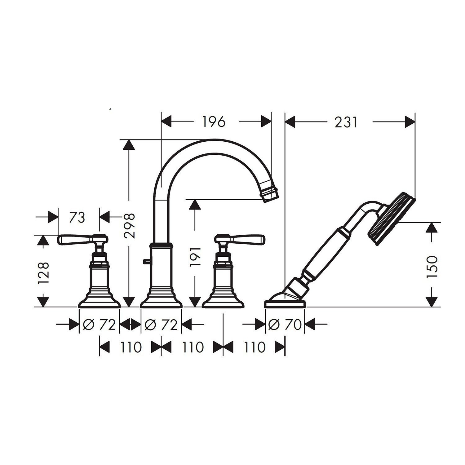 Смеситель на борт ванны, для монтажа на 4 отверстия, выступ излива 196 мм, вид соединения: скрытая часть, обычная (ламинарная) струя, расход воды 22 л/мин, керамические вентили для горячей и холодной воды с поворотом 90°, защита от обратного потока воды, максимальная длина ручного душа в вытянутом состоянии 110 см, встроенный держатель душа, класс шума: I, комплект поставки: рукоятки, излив на ванну, ручной душ с белой рукояткой 16320130 ½ дюйма, цвет изделия - 130 (Полированная бронза).