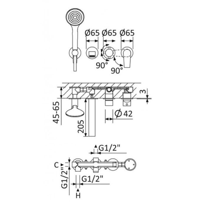 Встраиваемый Смеситель для ванны и душа Cezares (Цезарис) однорычажный с поворотным переключателем на 3 выхода, в комплекте с ручным душем, исполнение Б NAUTIC-VDM3-BIO