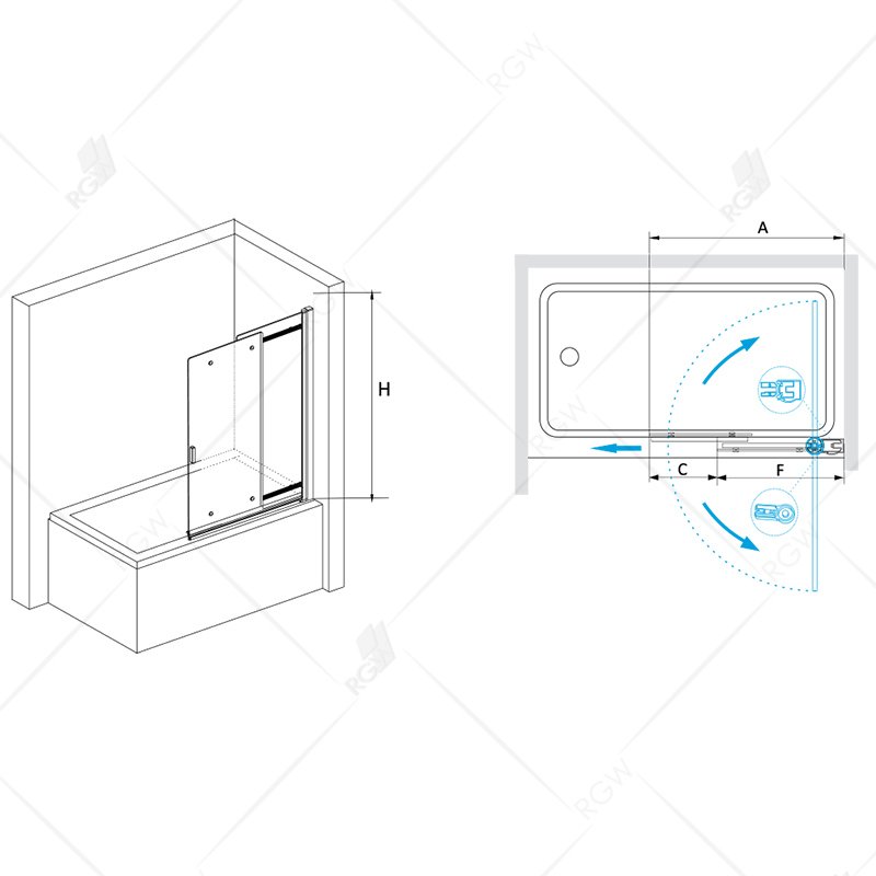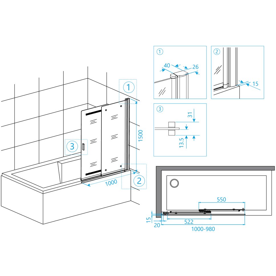 Шторка на ванну, сдвижная дверь маятниковая. Толщина закаленного, безопасного стекла 6 мм. Стекло сдвигается от 650 мм до 1000 мм. На двойных роликах. В комплекте порог душевого ограждения. Функция подъема стекла с доводчиком.