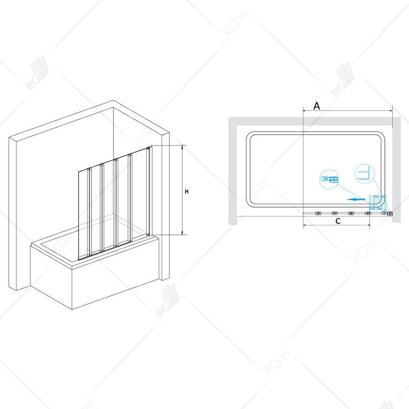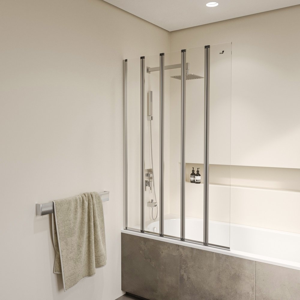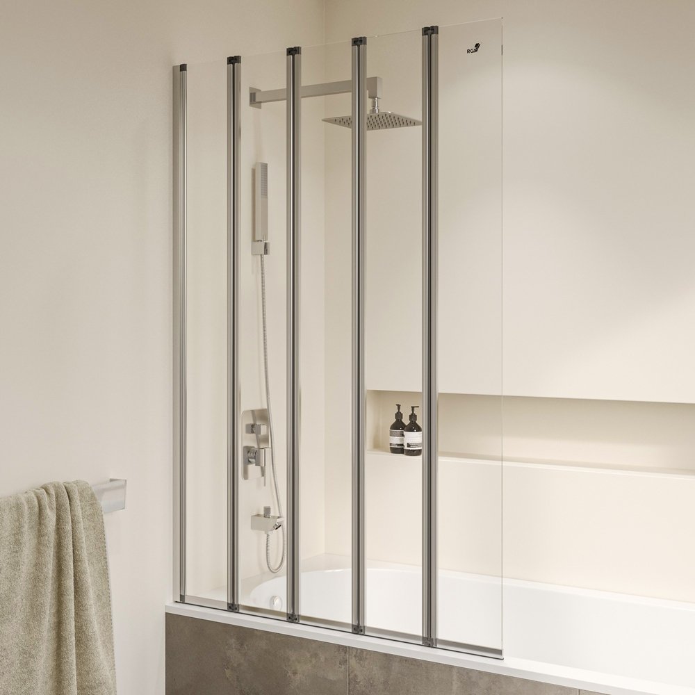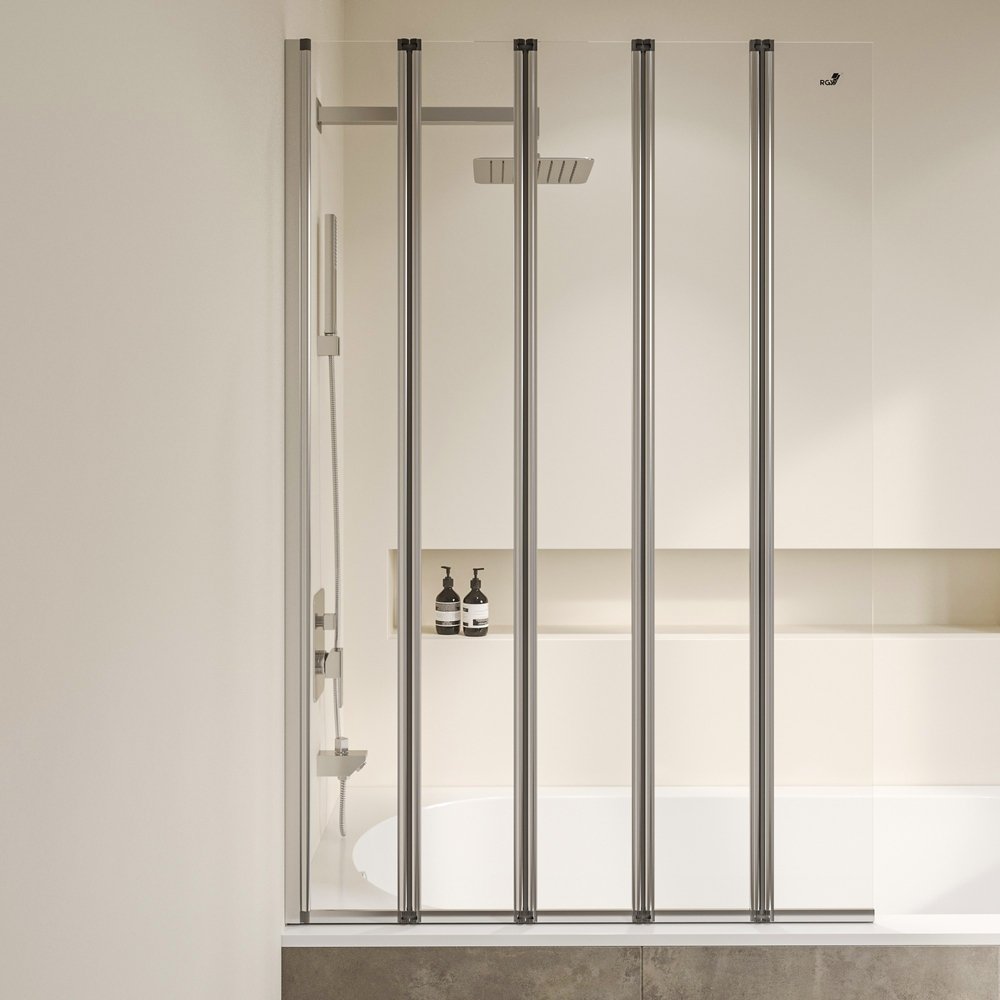 Шторка на ванну пятисекционная, складная дверь. Толщина закаленного, безопасного стекла 4 мм. Угол складывания 360°. Ширина створки 24 см. В комплекте порог душевого ограждения.