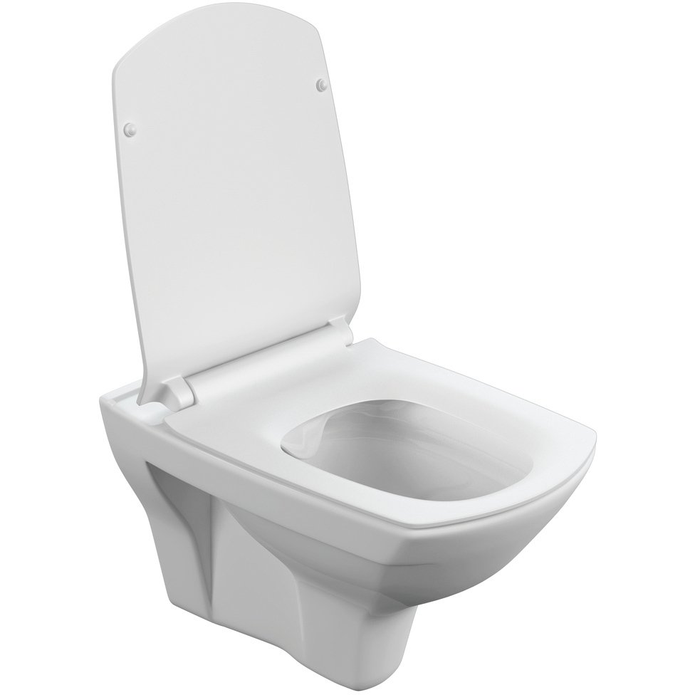 Безободковый подвесной унитаз с ультратонким, антибактериальным сиденьем с плавным закрыванием и легкосъемным механизмом.