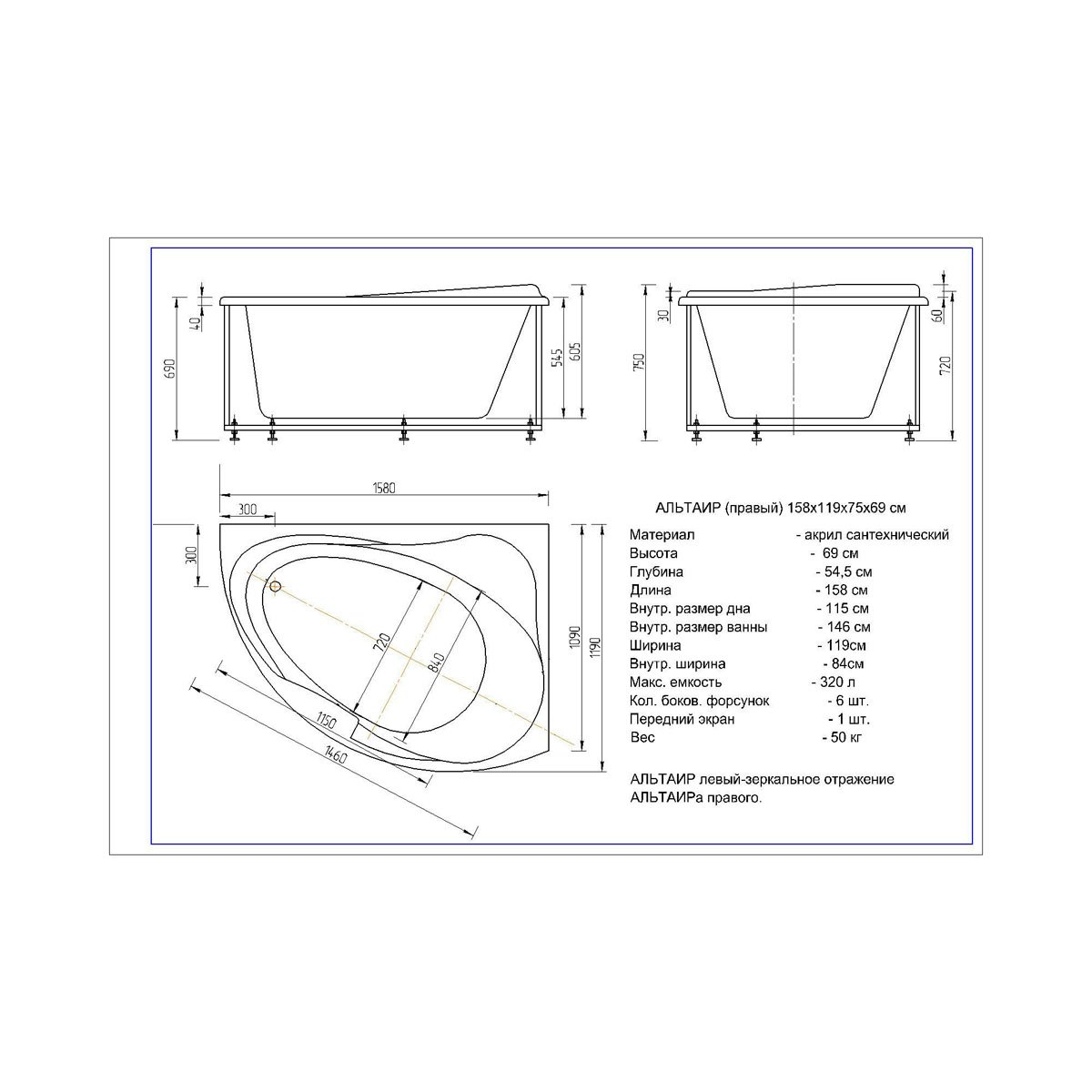Ванна акриловая Aquatek (Акватек) Альтаир с фронтальным экраном, без гидромассажа, вклеенный сварной каркас (правая) ALT160-0000047 Белый