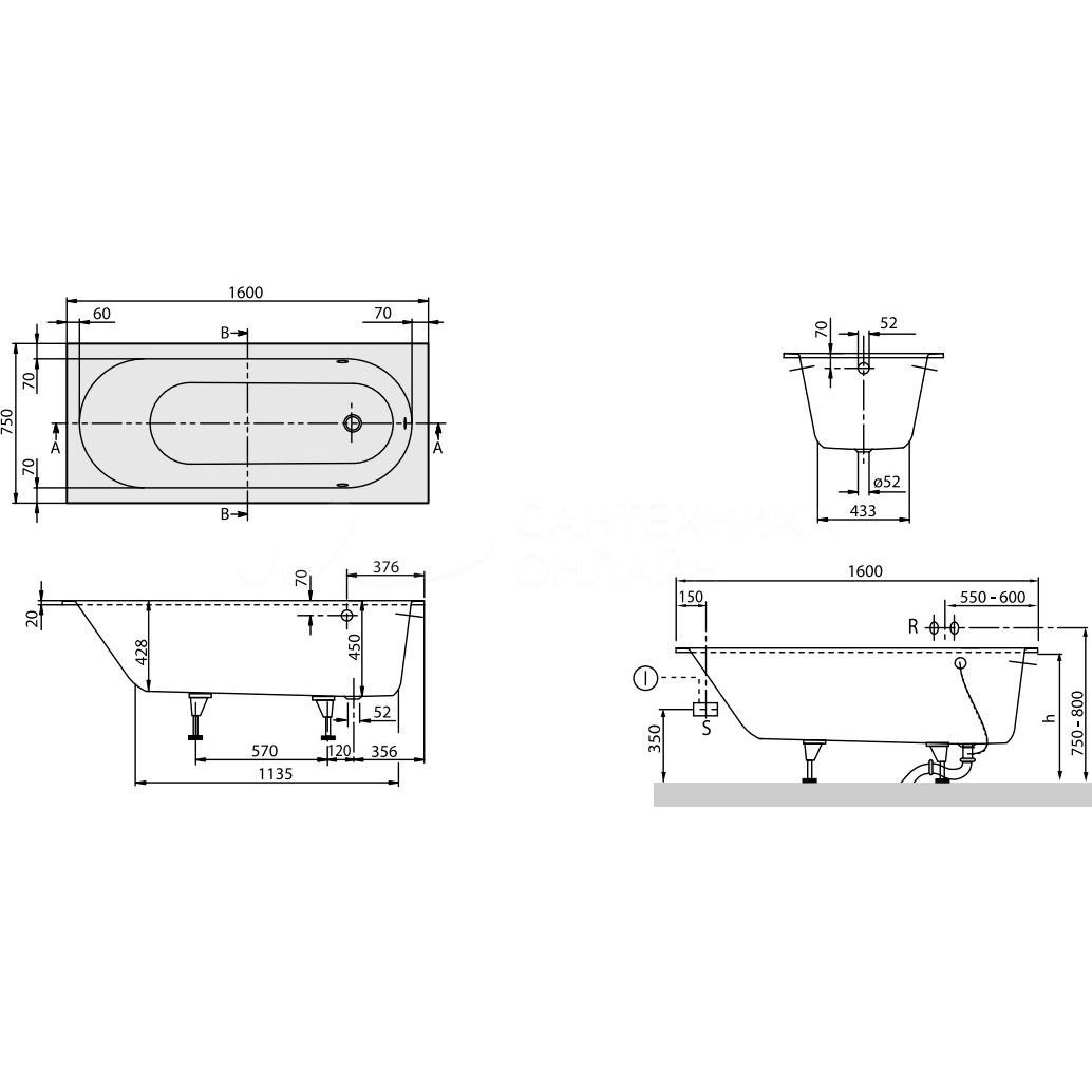 Ванна прямоугольная Villeroy and Boch (Виллерой энд Боч) Oberon материал Quaryl 1600х750х450 мм белая, (без монтажного комплекта/ножек)