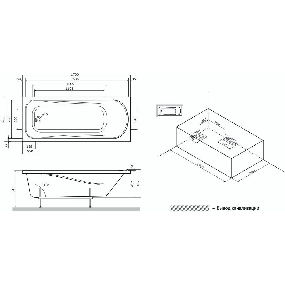 Ванна акриловая Am.Pm (Ам.Пм) Sense 170x70см, каркас, слив-перелив, комплект W75A-170-070W-KL белый