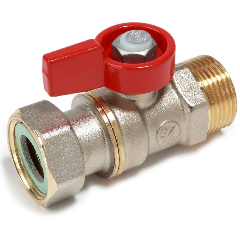 Кран шаровой с наружней резьбой для котлов и счетчиков, с отводом с накидной гайкой и ручкой-флажком.