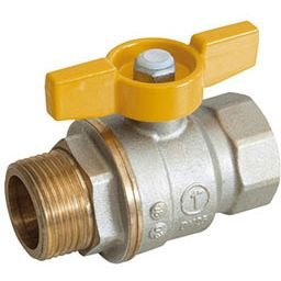 Кран шаровой полнопроходной, резьба внутренняя/наружная, никелированный, для газа, ручка - бабочка желтая.