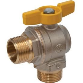 Кран шаровой угловой полнопроходной с желтой рукояткой, с внутренней и наружной резьбой, никелированный.