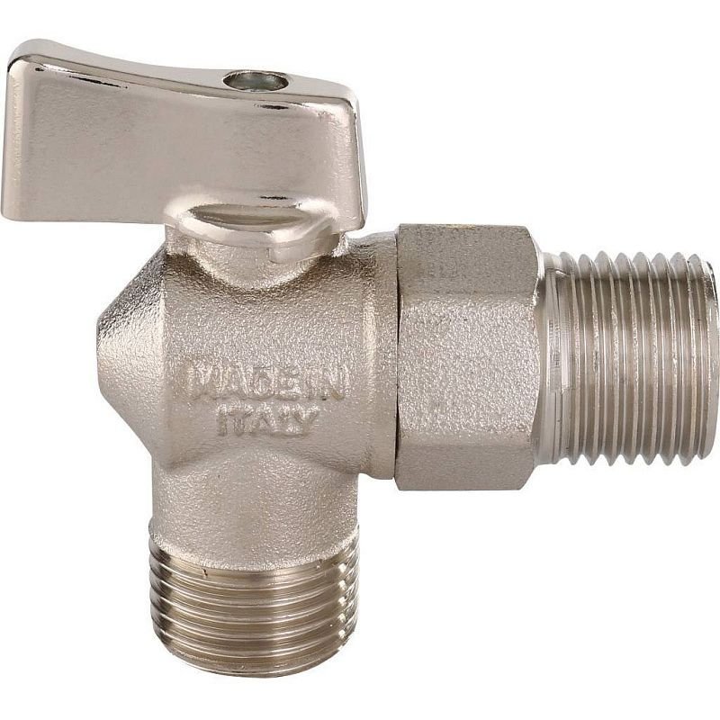 Шаровой кран Itap 391 для стиральной машины с металлической рукояткой. Корпус - никелированная латунь. Кран угловой, резьба наружная/наружная. Минимальная и максимальная рабочие температуры: 0°C, 110°C в отсутствии пара. Резьба ISO 228 (эквивалентно DIN EN ISO 228 и BS EN ISO 228).