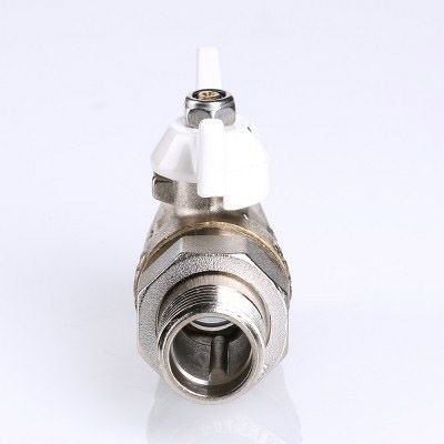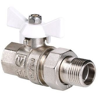 (VT.227.NW) Прямой полнопроходной ремонтопригодный шаровой кран с увеличенным ресурсом. Соединен накидной гайкой с резьбовым полусгоном. Корпуса деталей – латунные, никелированные. Кран оснащен ручкой типа "бабочка" с утолщенной стенкой из алюминиевого сплава и эпоксидной покраской белого цвета. Резьба присоединений – внутренняя/наружная.