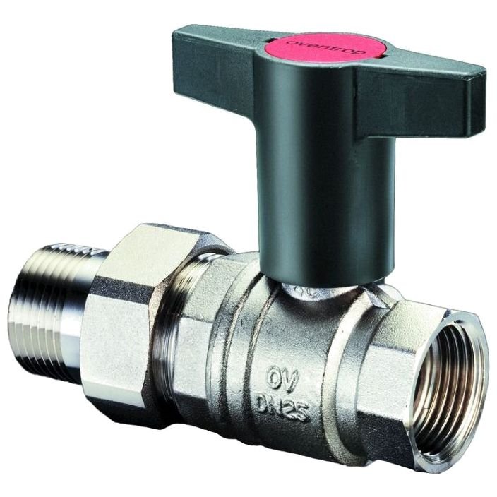 Шаровой кран Oventrop Optibal с накидной гайкой (американкой) с одной стороны имеют ниппель с наружной резьбой и коническим уплотнением, с другой стороны внутреннюю резьбу. Оснащн высокой Т-ручкой из пластмассы цвета антрацит с вмонтированной в не красной крышкой с надписью Oventrop. Выполняет запорно-регулирующую функцию в системах водоснабжения, отопления и охлаждения.
