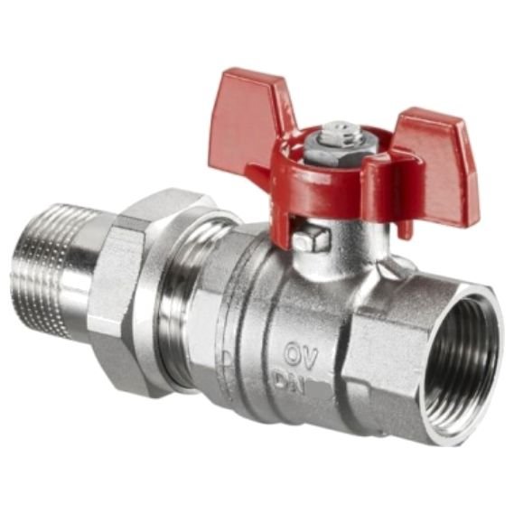 OVENTROP-кран шаровой Obtibal, латунный, рукоятка бабочкой, с одной стороны внутренняя резьба, с другой ниппель с наружной резьбой и накидной гайкой, PN16.